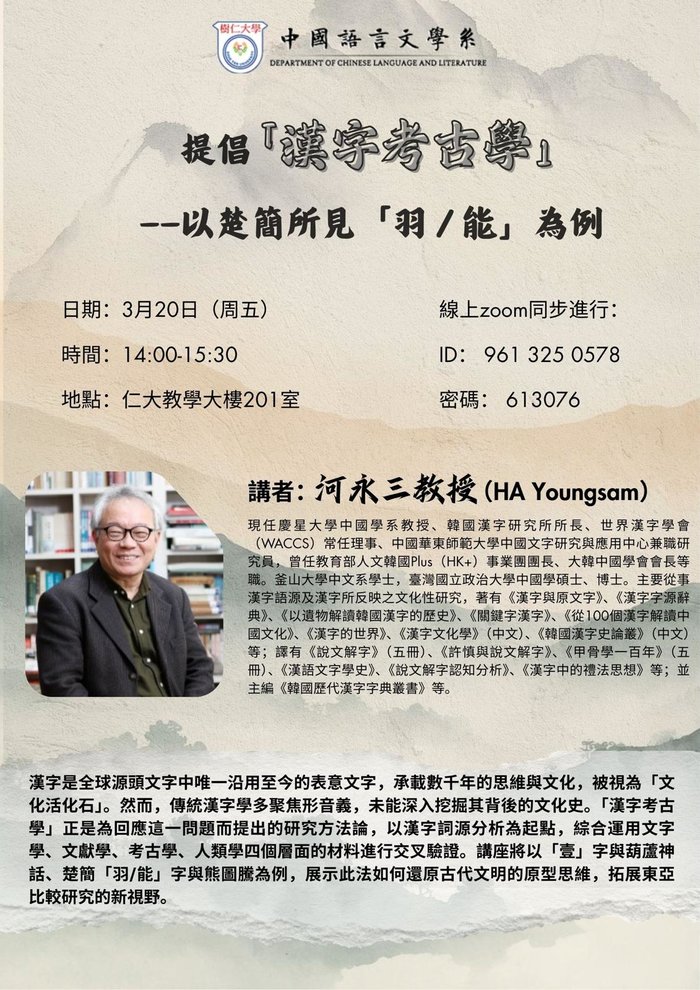 香港樹仁大學中國語言文學系於3月20日舉辦人文講堂講座,邀請到韓國慶星大學中國學系河永三教授蒞臨主講,講題為「提倡『漢字考古學』——以楚簡所見『羽/能』為例」。