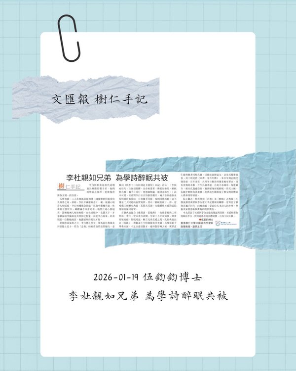 - 〈樹仁手記〉專欄更新:伍鈞鈞博士 李杜親如兄弟 為學詩醉眠共被