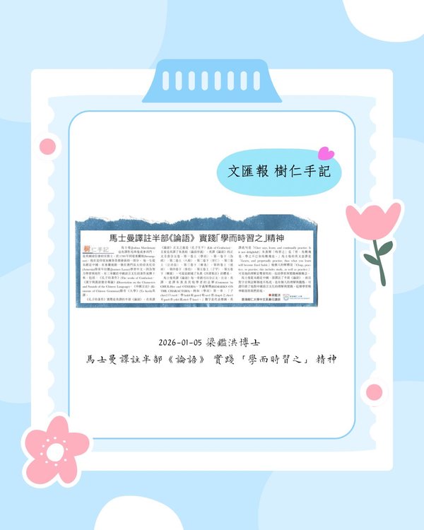 - 〈樹仁手記〉專欄更新:梁鑑洪博士 馬士曼譯註半部《論語》 實踐「學而時習之」精神