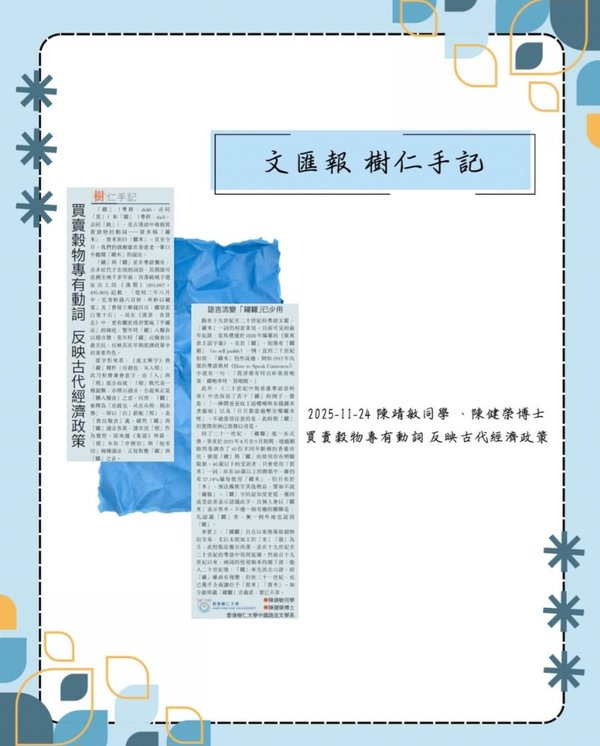 〈樹仁手記〉專欄更新:2025-11-24 陳靖敏同學、陳健榮博士 買賣穀物專有動詞 反映古代經濟政策